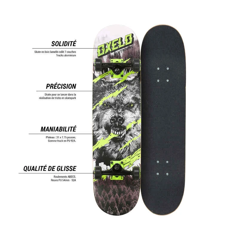 | Solidité | Skate en bois lamellé collé 7 couches. Trucks aluminium. |