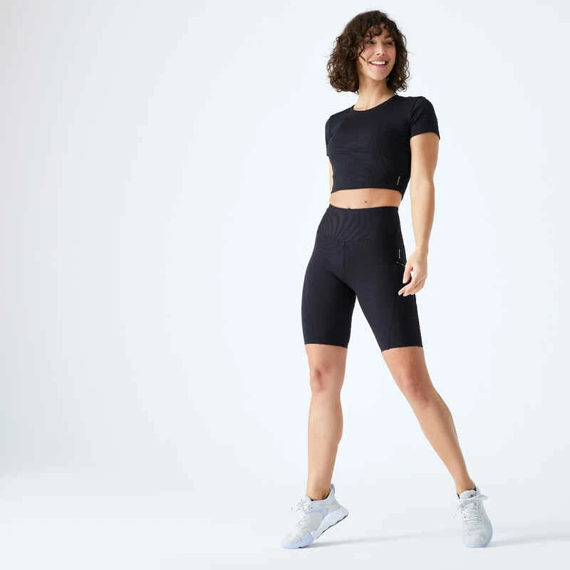 T-shirt Crop-top Manches Courtes Fitness Cardio Femme Noir